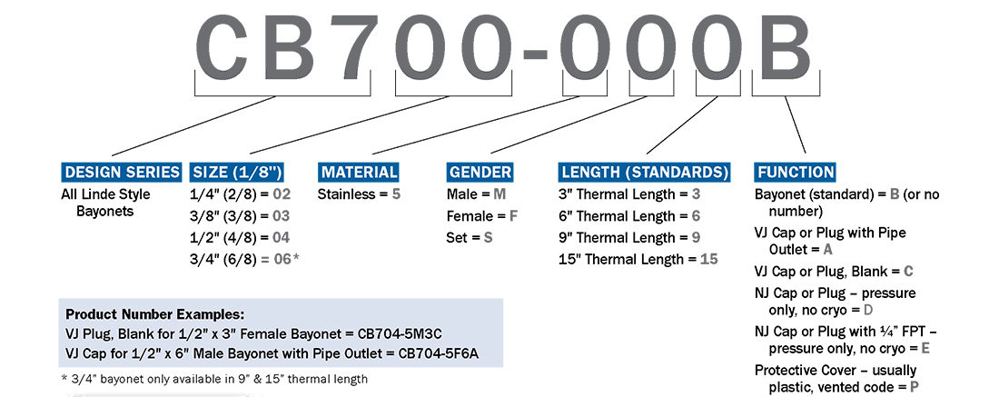 The CB700 series bayonet is made in four thermal lengths: 3″ to interchange with existing Linde installations, 6″, 9″ and 15″ to fit most thermal and physical criteria. Inner lines are 1/2″ OD tube size with adapters available for 1/4″, and 3/8″.
